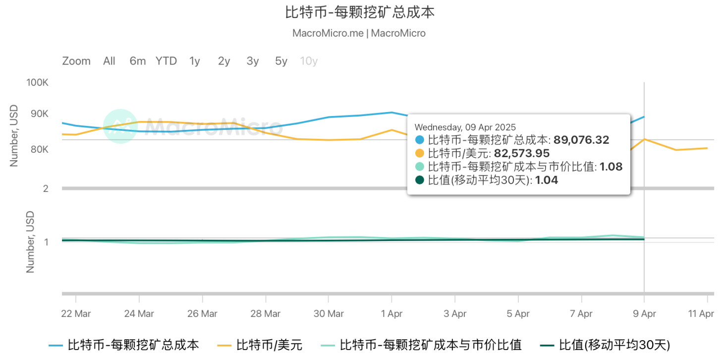 وفقًا لأحدث نموذج من MacroMicro، اعتبارًا من 9 أبريل 2025، يُقدّر تكلفة إنتاج وحدة بيتكوين بحوالي 89,076.32 دولار، في حين أن السعر الفوري في ذلك اليوم حوالي 82,573.95 دولار، ونسبة تكلفة التعدين إلى السعر (Mining Cost-to-Price Ratio) هي 1.08. هذه النسبة أعلى بكثير من 1، مما يشير إلى أن السعر الحالي في السوق أقل من متوسط تكلفة التعدين على الشبكة، مما يعني أن الشبكة بشكل عام تعمل تحت نقطة التعادل، ومعظم عمال المناجم في حالة ضغط الأرباح أو خسارة.