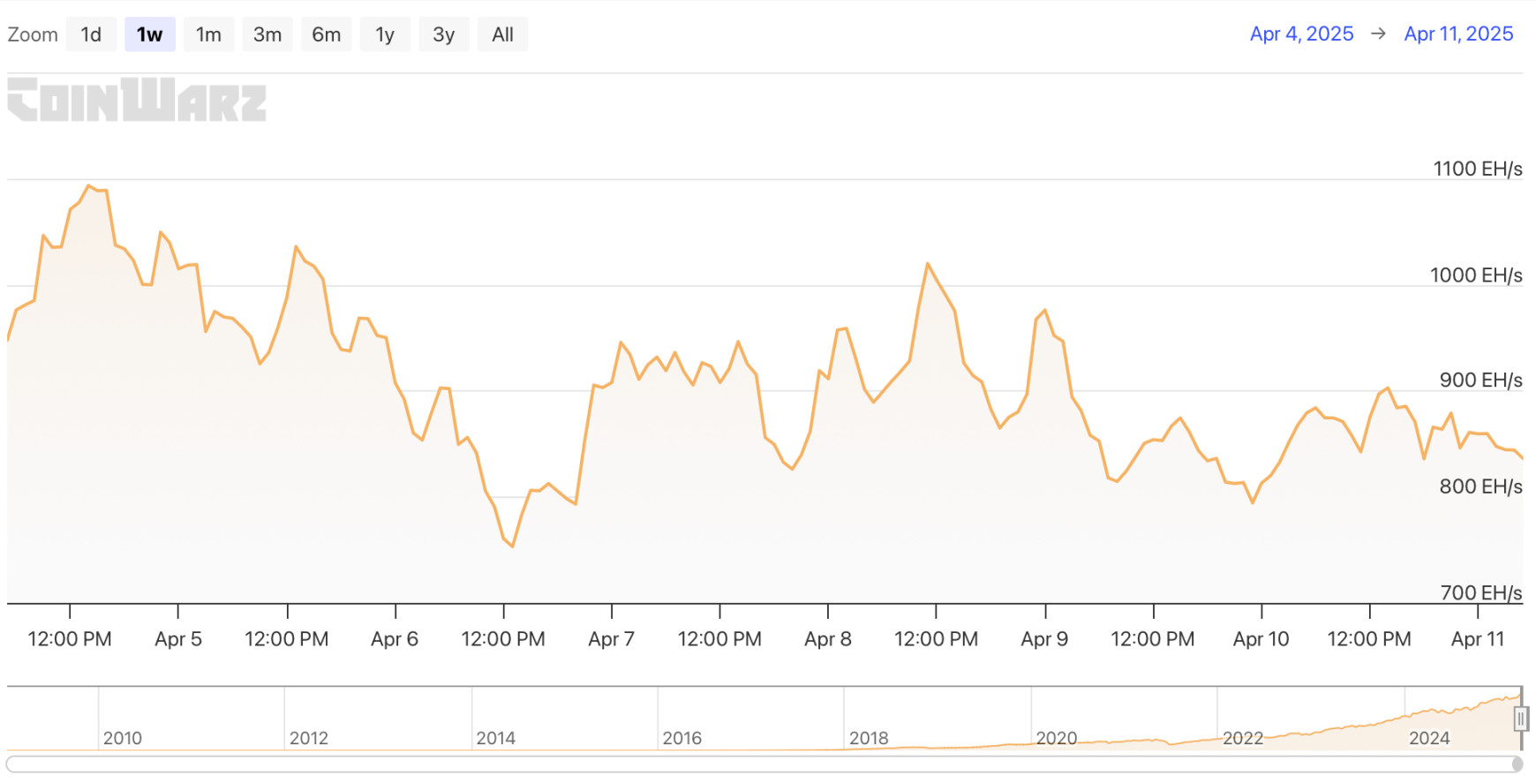 في الفترة من 5 أبريل 2025 إلى 11 أبريل 2025، أظهر معدل هاش شبكة بيتكوين تقلبًا، وكانت التفاصيل كما يلي: