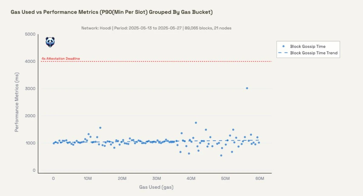 وفقًا لدراسة ethpandaops، بعد زيادة حد الغاز إلى 60000000، يمكن اكتشاف حوالي 90% من الكتل لأول مرة في أقل من 1016 مللي ثانية. مقارنةً بالسابق، زادت تأخيرات انتشار الكتل قليلاً، ولكن لا تزال ضمن النطاق المقبول.