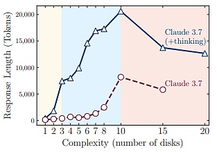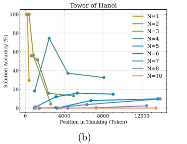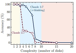 ومع ذلك، طرح فريق مكون من ستة باحثين من شركة آبل تساؤلات حول ذلك. من خلال جعل النموذج يجيب على مجموعة متنوعة من الألغاز، اكتشف فريق البحث أن النماذج الكبيرة الرائدة مثل DeepSeek-R1 و o3-mini و Claude-3.7-Sonnet-Thinking تفشل في الحفاظ على دقتها بعد تجاوز عتبة معينة من التعقيد.