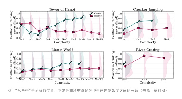 ثالثًا، اكتشف فريق البحث أن النماذج الكبيرة للاستدلال لديها حد توسع مرتبط بتعقيد المشكلة في قدرة الاستدلال، ويمكن تأكيد ذلك من خلال الاتجاه المعاكس في عدد رموز التفكير بعد الوصول إلى نقطة تعقيد معينة.