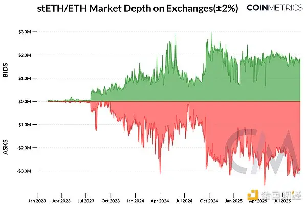 كما هو مذكور أعلاه، فإن سيولة LST مثل stETH من Lido أكثر تشتتًا بين المنصات المختلفة. على الرغم من أن معظم سيولة stETH كانت متركزة في البداية في بركة stETH/ETH في Curve، إلا أنها توسعت تدريجيًا لتشمل DEX وCEX أخرى مثل Balancer. تمتلك أسواق stETH-ETH الفورية في البورصات مثل Deribit وBybit وOKX سيولة تبلغ حوالي 4.6 مليون دولار، مع تقلبات في نطاق ±2% من السعر الوسيط (سعر الشراء 1.6 مليون دولار / سعر البيع 3 ملايين دولار).