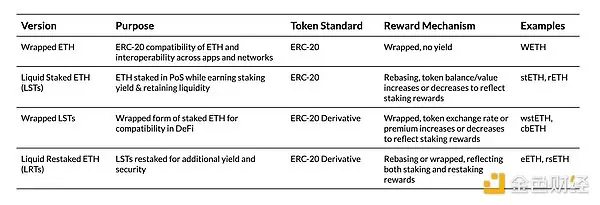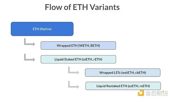 حاليًا، الأصول المرتبطة بالإيثيريوم تتواجد بشكل رئيسي في الأشكال التالية: ETH الأصلي، ETH المغلف، ETH المودع السائل (LST) و ETH المودع السائل المتجدد (LRT). على الرغم من أن هذه المتغيرات قد تزيد من التعقيد، إلا أن ظهورها يهدف إلى معالجة القيود السابقة، وزيادة السيولة، والقابلية للتجميع، والحصول على فرص جديدة للعائدات على السلسلة.