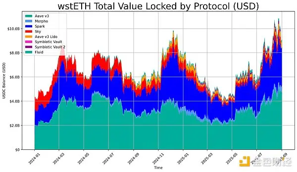 لديود حوالي 100 مليار دولار من ETH المربوطة (wstETH) المقفلة في بروتوكولات الإقراض DeFi على شبكة إيثريوم الرئيسية، مما يبرز دورها كأصل ضمان أساسي. في الممارسة العملية، يقوم المستخدمون عادةً بإيداع LST لاقتراض ETH أو العملات المستقرة، ثم من خلال استراتيجية “الدورية”، يعيدون استثمار العائدات لشراء المزيد من stETH، مما يعزز عوائد التخزين. كما أنه يدعم خزائن الإقراض وإعادة التخزين، مما يجمع بين مكافآت التخزين وفائدة الضمان، وبالتالي يزيد من كفاءة رأس المال. مع تزايد الطلب على الأصول المعنونة والعوائد، كما يظهر LST، من المحتمل أن تلعب دورًا أساسيًا في سوق DeFi.