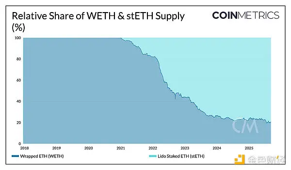 حوالي 24% من ETH يتم رهنها من خلال Lido، وقد أصبحت stETH وأشكالها المغلفة wstETH أشكالاً شائعة الاستخدام من الضمانات في DeFi، وغالباً ما تستخدم في استراتيجيات الدورة لزيادة العائد.