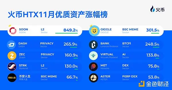 في نوفمبر، شهد سوق العملات الرقمية ظروفًا هيكلية بفضل محفزات متعددة من الناحية الكلية والسردية، بدءًا من BTCFi و AI و L2 إلى DEX و MEME، حيث تسارعت دورات المشاريع عبر المسارات المختلفة. وبفضل آلية “الاختيار الصارم، والاستجابة السريعة” التي تعززها HTX، حققت العديد من الأصول عالية الجودة أداءً رائعًا بعد الإطلاق.