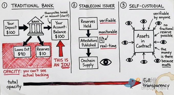 الفرق هو أن مخاطر المصدر يمكن مراقبتها. يمكنك الاطلاع على إثبات الاحتياطيات. يمكنك مراقبة تدفقات الأموال على السلسلة. يمكنك التنويع بين مصادر الإصدار المختلفة. أما المخاطر في البنوك التقليدية فهي مخفية داخل الصندوق الأسود للمؤسسة، حتى يحدث كارثة.