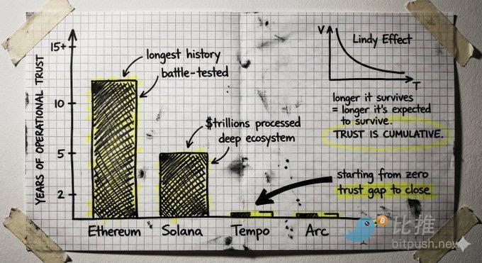 بناء Layer 1 جديد من الصفر يعني أن الثقة تبدأ من جديد. البلوكشين هو آلة ثقة، والثقة تتراكم عبر التشغيل المستمر. تأتي من سجل خالٍ من الأعطال الكارثية لسنوات، ومن ضمان حماية مليارات الدولارات بدون ثغرات، ومن بيئة مطورين يفهمون الحدود بشكل عميق، ومن كود تم اختباره عبر هجمات وتحديات. هذا هو تأثير ليندي (Lindy effect) على البنية التحتية.