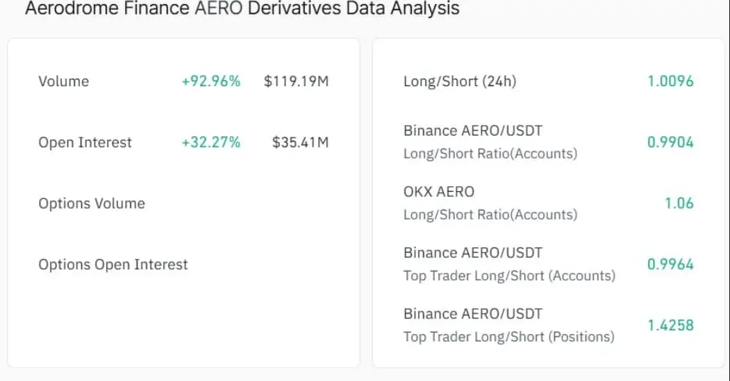 ارتفعت العقود المفتوحة (OI) الخاصة بـ AERO بشكل كبير بنسبة 32%، لتصل إلى 35.4 مليون دولار، بينما قفز حجم التداول في العقود الآجلة بنسبة 92%، وفقًا لبيانات CoinGlass.