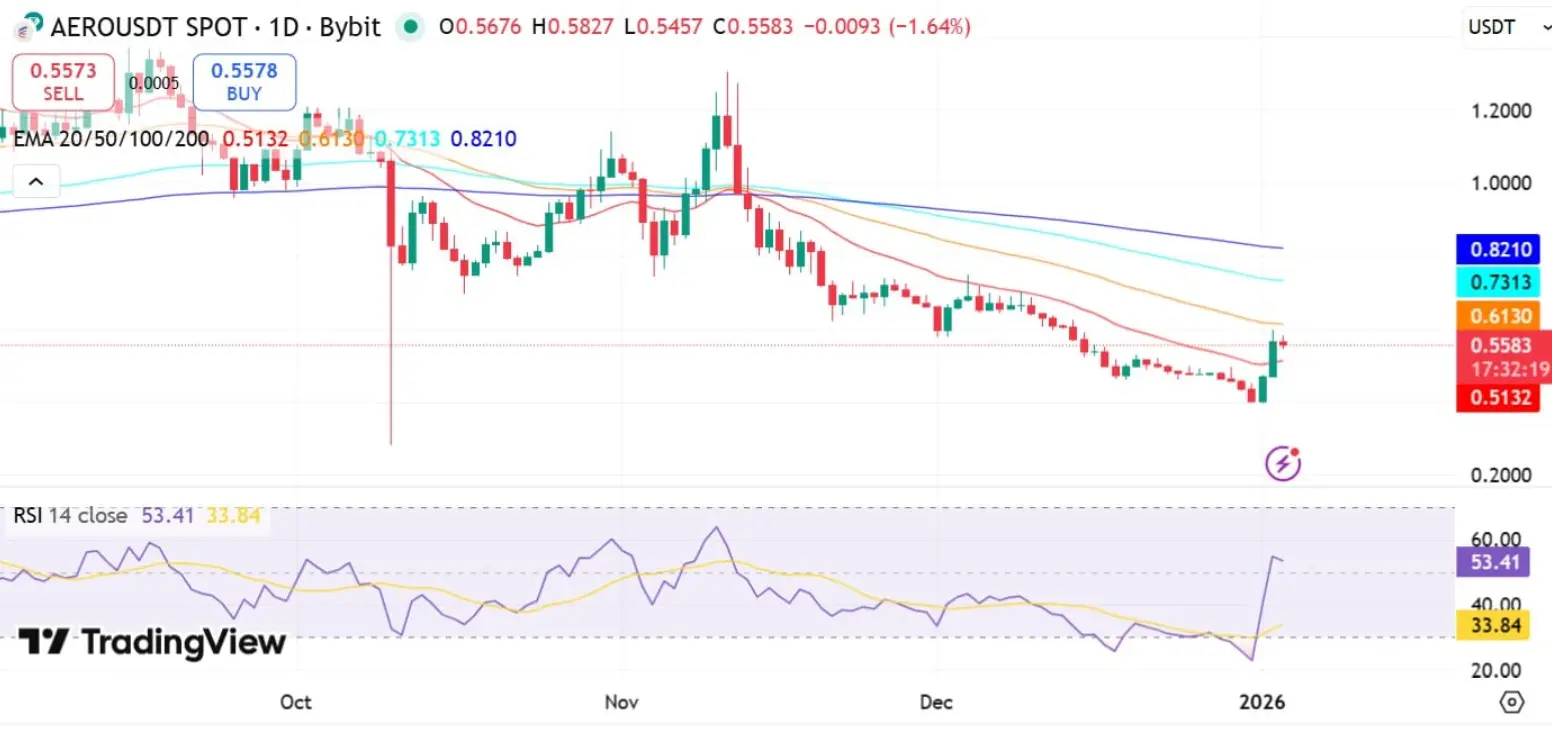 خلال موجة الانتعاش العامة في سوق العملات الرقمية، برزت عملة Aerodrome Finance (AERO) بشكل لافت مع قفزة ملحوظة، كادت أن تمحو جميع الخسائر التي حدثت في ديسمبر. حافظت هذه العملة البديلة على مستوى دعم رئيسي عند 0.40 دولار، ثم سرّعت من وتيرتها لتصل إلى قمة محلية عند 0.59 دولار قبل أن تدخل في تصحيح خفيف.