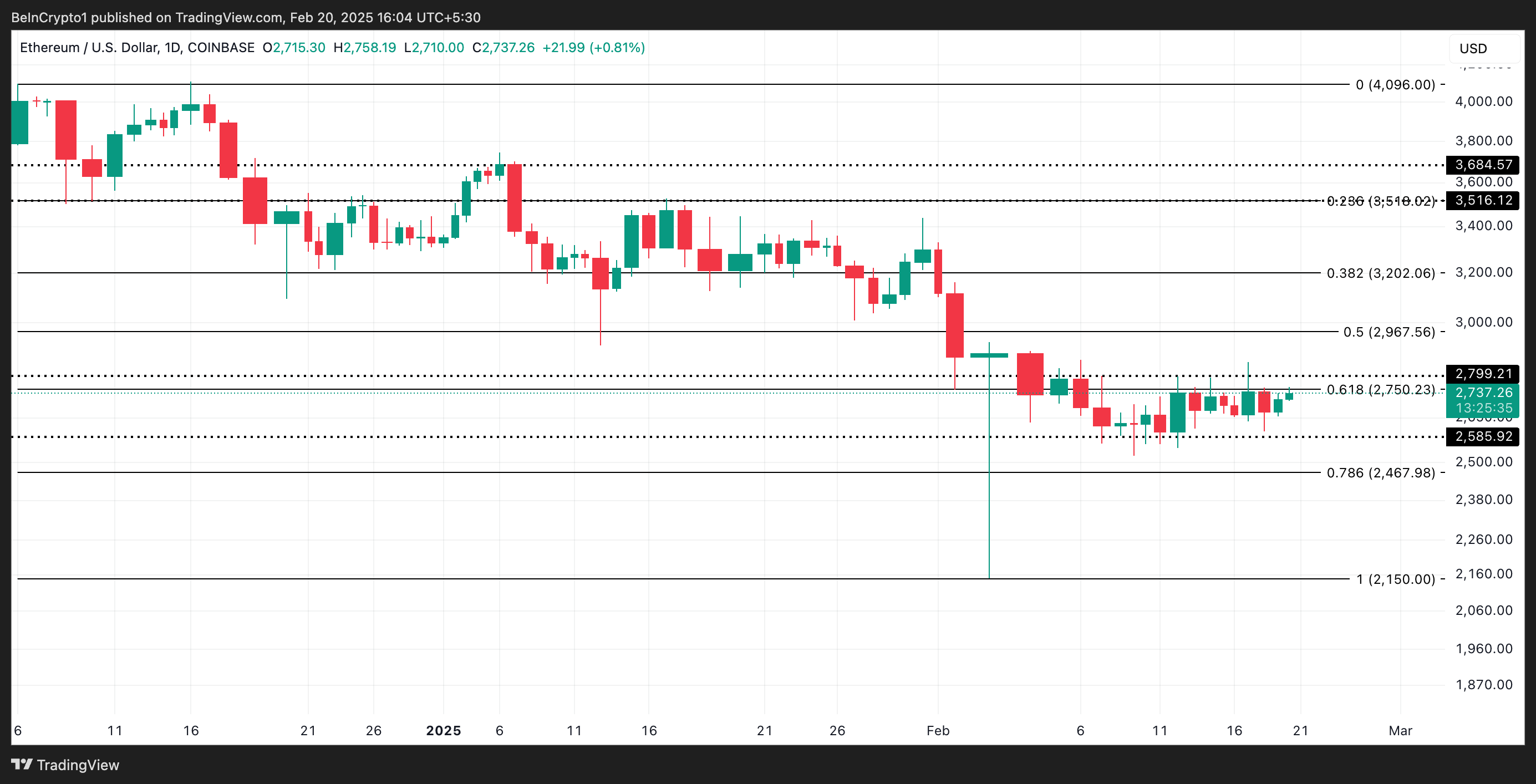 إثيريوم (ETH) تم التداول داخل نطاق ضيق منذ بداية فبراير، يتراوح بين مستويات الدعم الرئيسية ومقاومة.