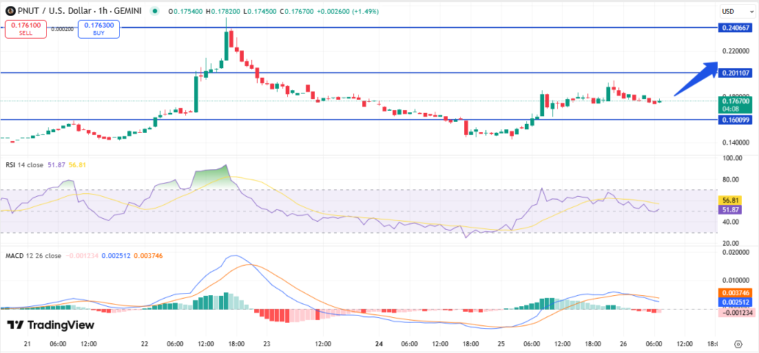 تشير المؤشرات الفنية على الرسم البياني لكل ساعة إلى أن PNUT يتداول في مسار صعودي. ومع ذلك ، فإن الزخم الصعودي يهدأ حيث يبدأ ضغط البيع في السيطرة على سوق PNUT.