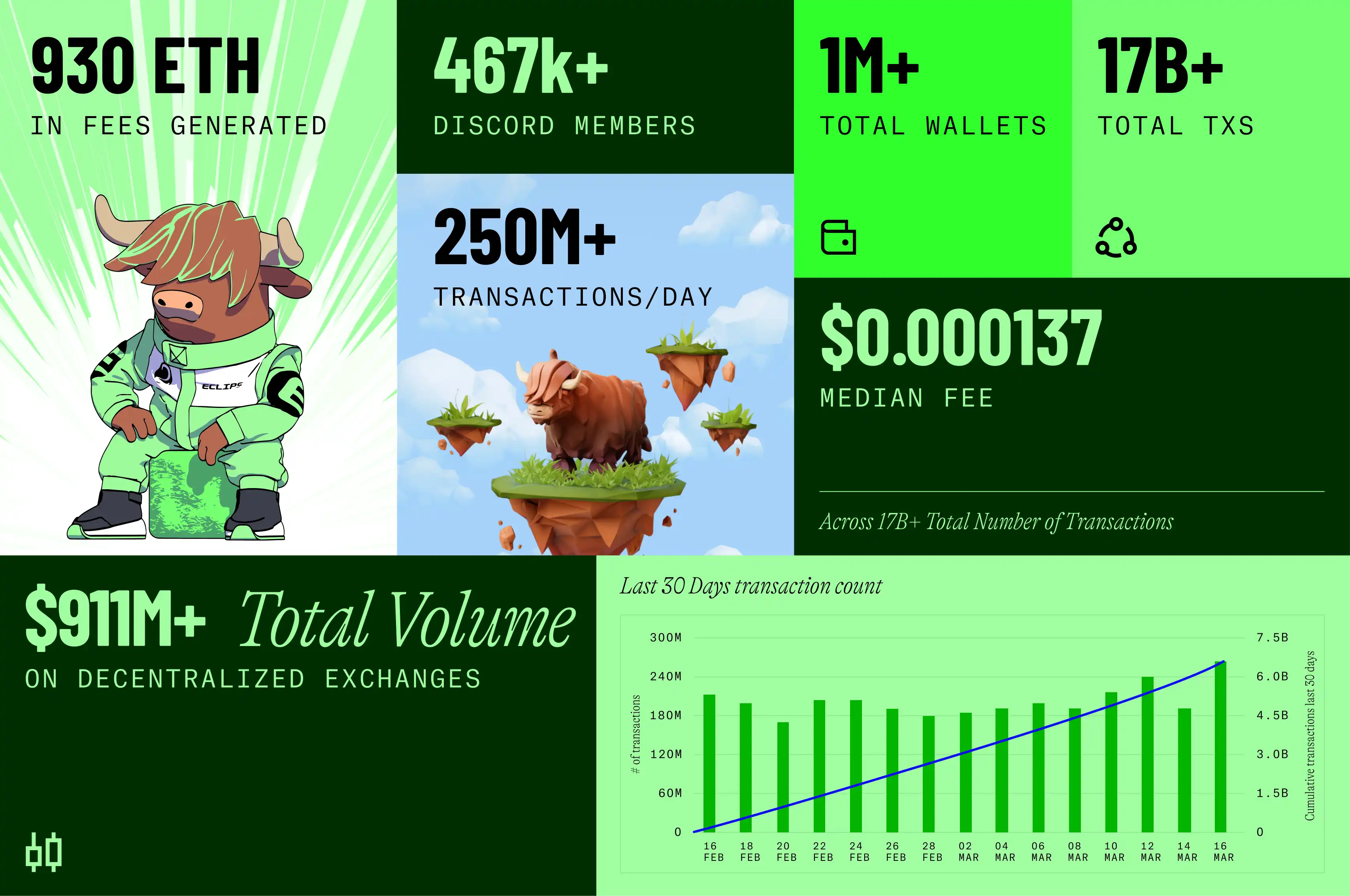 منذ إطلاق الشبكة الرئيسية في نوفمبر من العام الماضي، حققت المنصة إيرادات قدرها 930 ايثر، ولديها أكثر من 467,000 عضو في Discord، ويشارك فيها أكثر من مليون محفظة، حيث تم معالجة أكثر من 17 مليار صفقة. تعالج Eclipse أكثر من 250 مليون صفقة يوميًا، وقد تجاوز حجم التداول على DEX 911 مليون دولار، ويتراوح عدد الصفقات اليومية بين 120 مليون و240 مليون صفقة.