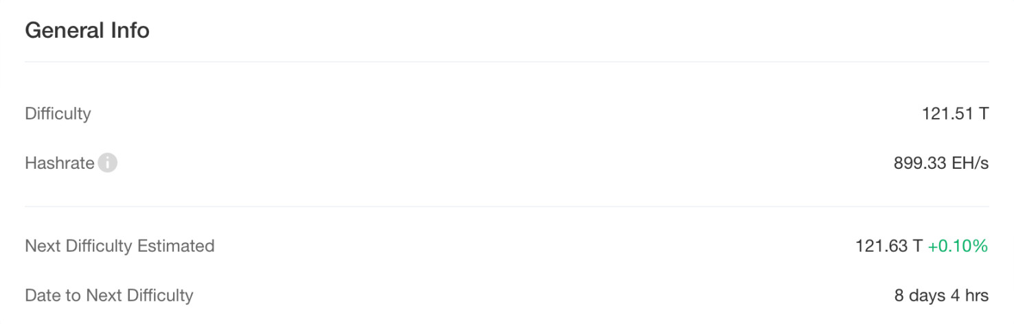 Según los datos de CloverPool, Bitcoin completó el último ajuste de dificultad a la altura del bloque 891.072 (21:50:26 hora de Pekín del 5 de abril), lo que elevó la dificultad en un 6,81% hasta los 121,51 T, un récord. En el momento de escribir este artículo, la potencia de cálculo total de toda la red es de unos 899,33 EH/s, y la dificultad de minería actual ha aumentado a 121,63 T. Según el intervalo de bloque actual, se espera que el próximo ajuste de dificultad tenga lugar en unos 8 días, con un aumento estimado del +0,10%. A medida que la dificultad de la red continúa aumentando, los requisitos de los mineros para el rendimiento de los equipos y la relación de eficiencia energética han aumentado simultáneamente, y las operaciones mineras se han ajustado gradualmente a la dirección de alta eficiencia y eficiencia energética, lo que a su vez afecta la estructura general de consumo de energía.