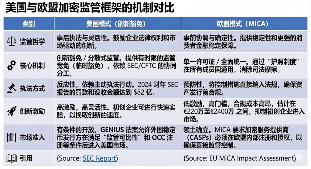 La exención de innovación de EE. UU. y el modelo más flexible de EE. UU. contrastan con el enfoque de “coordinación previa” representado por la regulación MiCA de la UE, formando dos polos en la regulación global de activos digitales, con diferencias filosóficas y operativas.