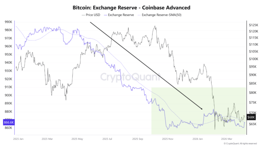 The report of Novaque Research from CryptoQuant explains that Binance is currently holding about 637.6K BTC in reserves, while Coinbase Advanced holds roughly 866.6K BTC. Both are still tracking well below their levels from earlier in 2025.