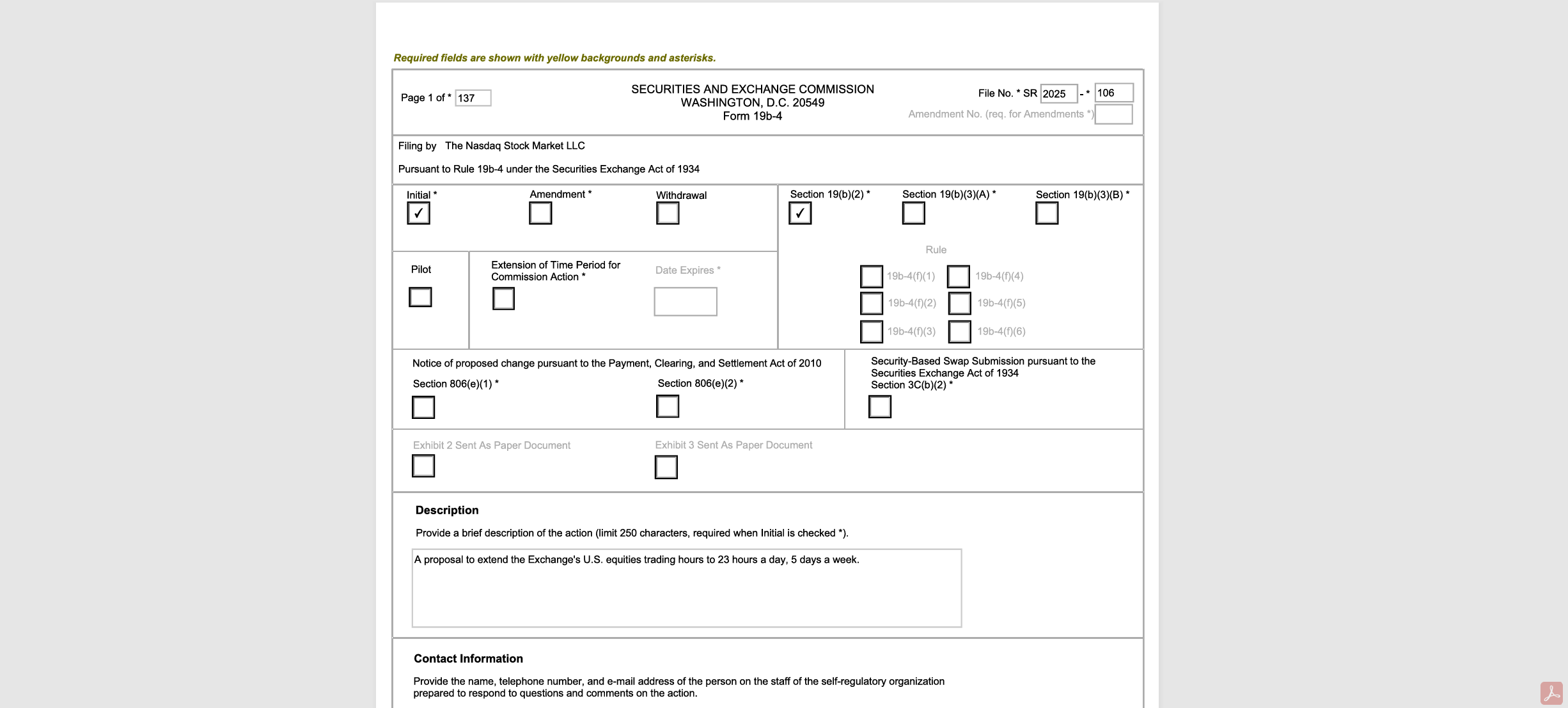 Le 15 décembre, le Nasdaq a officiellement soumis des documents à la Securities and Exchange Commission (SEC) des États-Unis, prévoyant d'étendre les heures de négociation de l'actuel 5 jours par semaine, 16 heures par jour (avant l'ouverture / pendant la journée / après la fermeture), à 5 jours par semaine, 23 heures par jour (jour / nuit).