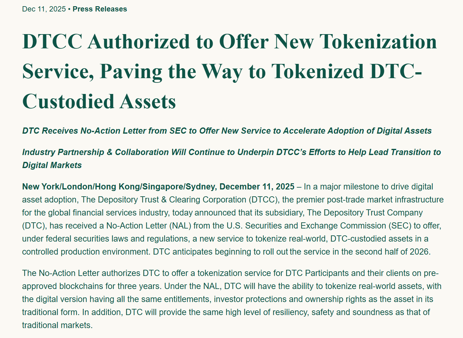 DTCC Fondamentaux : Le 12 décembre, la société de dépôt et de fiducie (DTC), filiale de DTCC, a reçu une lettre de non-objection de la SEC américaine, approuvant son service de tokenisation d'actifs du monde réel dans un environnement de production contrôlé, avec un lancement prévu au second semestre 2026, visant à résoudre les problèmes de conformité les plus fondamentaux en matière de compensation et de garde ;