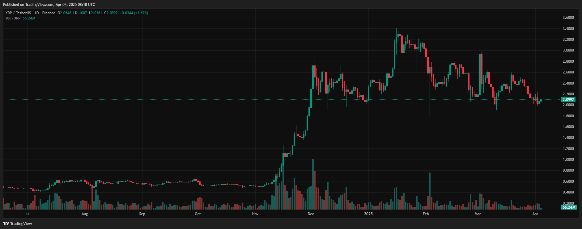 Sementara itu, token asli XRP dari Ripple belum mencatatkan tindakan harga yang positif. Saat ini, token tersebut diperdagangkan sekitar $2,09, naik tipis 2% dalam 24 jam terakhir, masih jauh di bawah rata-rata bergerak, dengan tanda-tanda fase distribusi yang semakin meningkat.