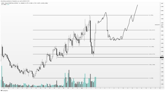Menurut analis yang menggunakan nama samaran, GRASS kemungkinan akan mengalami penurunan sebelum melanjutkan reli. Berdasarkan grafik Sherpa pada kerangka waktu empat jam, tampaknya trader yang banyak diikuti ini menyarankan bahwa GRASS bisa mengalami koreksi sekitar 15% sebelum reli lebih dari 20% dalam hitungan hari.