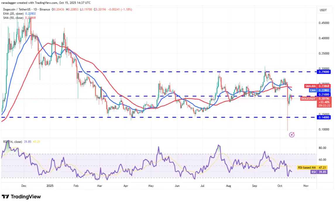 Grafik DOGE/USDT harian | Sumber: TradingViewFluktuasi harga dalam rentang ini kemungkinan besar akan acak dan sangat volatil. Rata-rata bergerak eksponensial (EMA) 20 hari sedang menurun, bersama dengan indeks RSI sekitar 40, menunjukkan bahwa pihak beruang memiliki sedikit keuntungan. Jika harga berbalik turun dan menembus level 0,18 USD, pasangan DOGE/USDT dapat jatuh ke 0,16 USD. Diperkirakan, pihak banteng akan bertahan dengan kuat di zona 0,14 – 0,16 USD.