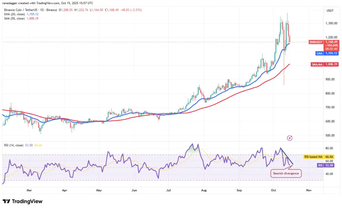 BNB tidak dapat bertahan di zona 1.350 USD pada hari Senin, menyebabkan investor jangka pendek take profit, menarik harga turun ke garis EMA 20 hari (1.155 USD) pada hari Selasa.