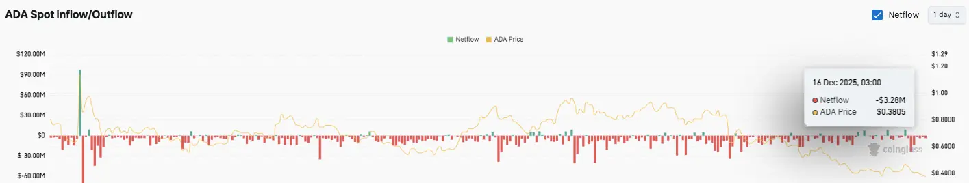 Terutama, arus keluar meningkat selama penurunan harga terbaru, menandakan pengurangan risiko yang berkelanjutan. Data terbaru menunjukkan sekitar $3,28 juta arus keluar bersih, sejalan dengan kisaran perdagangan ADA saat ini. Oleh karena itu, arus spot menunjukkan minat akumulasi yang terbatas dan posisi defensif.