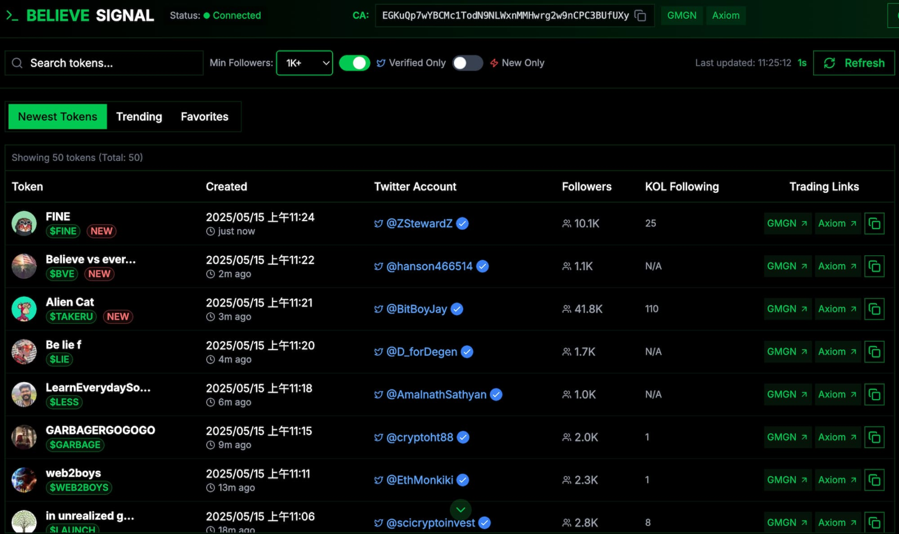 Believe Signal は、最低フォロワー数、Twitter アカウントの認証状況に基づいてトークンをフィルタリングし、Twitter フォロワー数を表示するとともに、GMGN の市場データに直接リンクします。