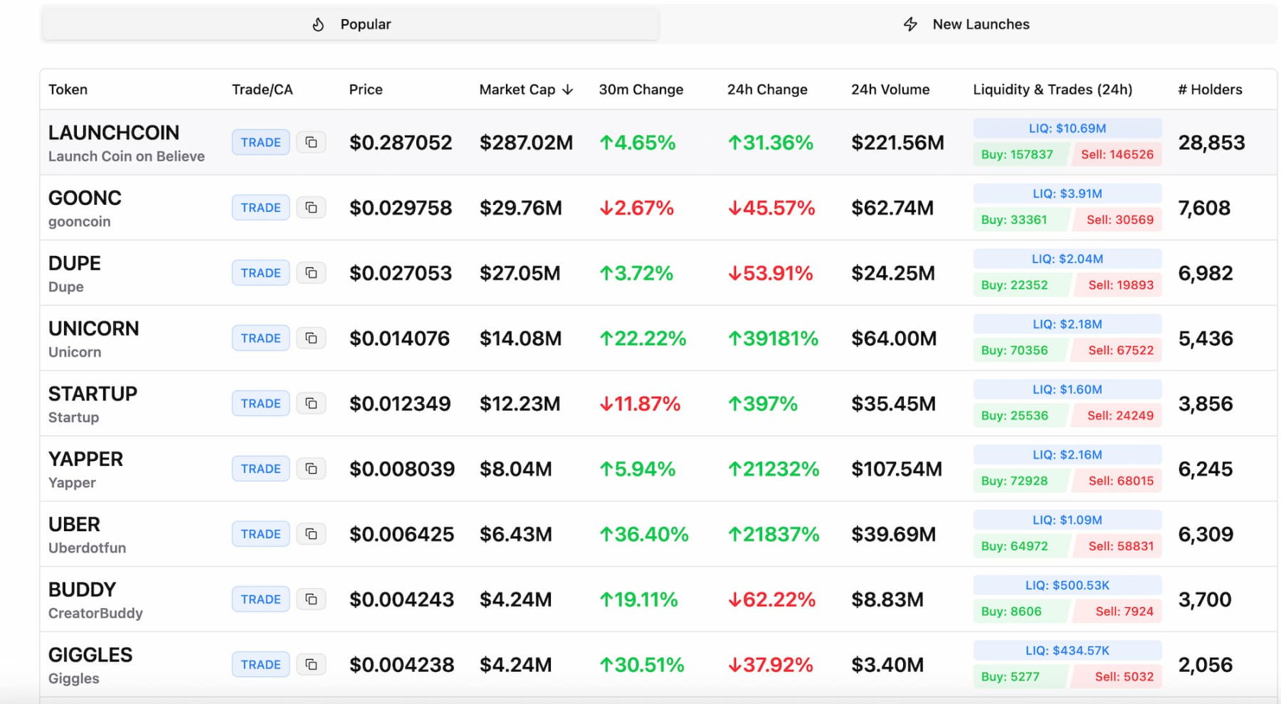 Believe Screenerは@nanowispによって構築されており、市場価値、取引量、価格上昇率でBelieveエコシステムのトークンを並べ替えることができ、リアルタイムでBelieveで新しく開始されたトークンを表示し、関連するツイートにナビゲートできます。Believe Screenerのウェブサイトの右下隅には新しいトークンのプッシュモジュールが設定されており、ユーザーが即時の新トークンの動向をキャッチできるようになっています。