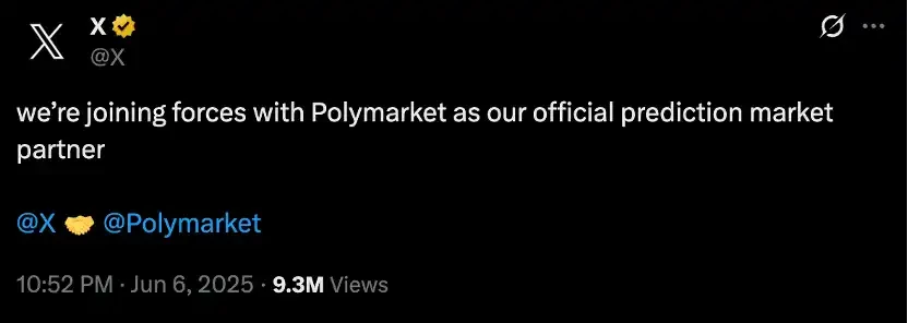 6月6日、Xは正式にPolymarketとの提携を発表し、Xの公式予測市場パートナーとなりました。XはPolymarketにデータ駆動型の洞察を提供し、Polymarketの予測結果はXプラットフォームにフィードバックされます。Grokからのリアルタイム解釈と関連するXの投稿を組み合わせて、説明可能な予測データフローを実現します。この提携により、$Pculeの通貨価格は歴史的な最高値を記録しました。