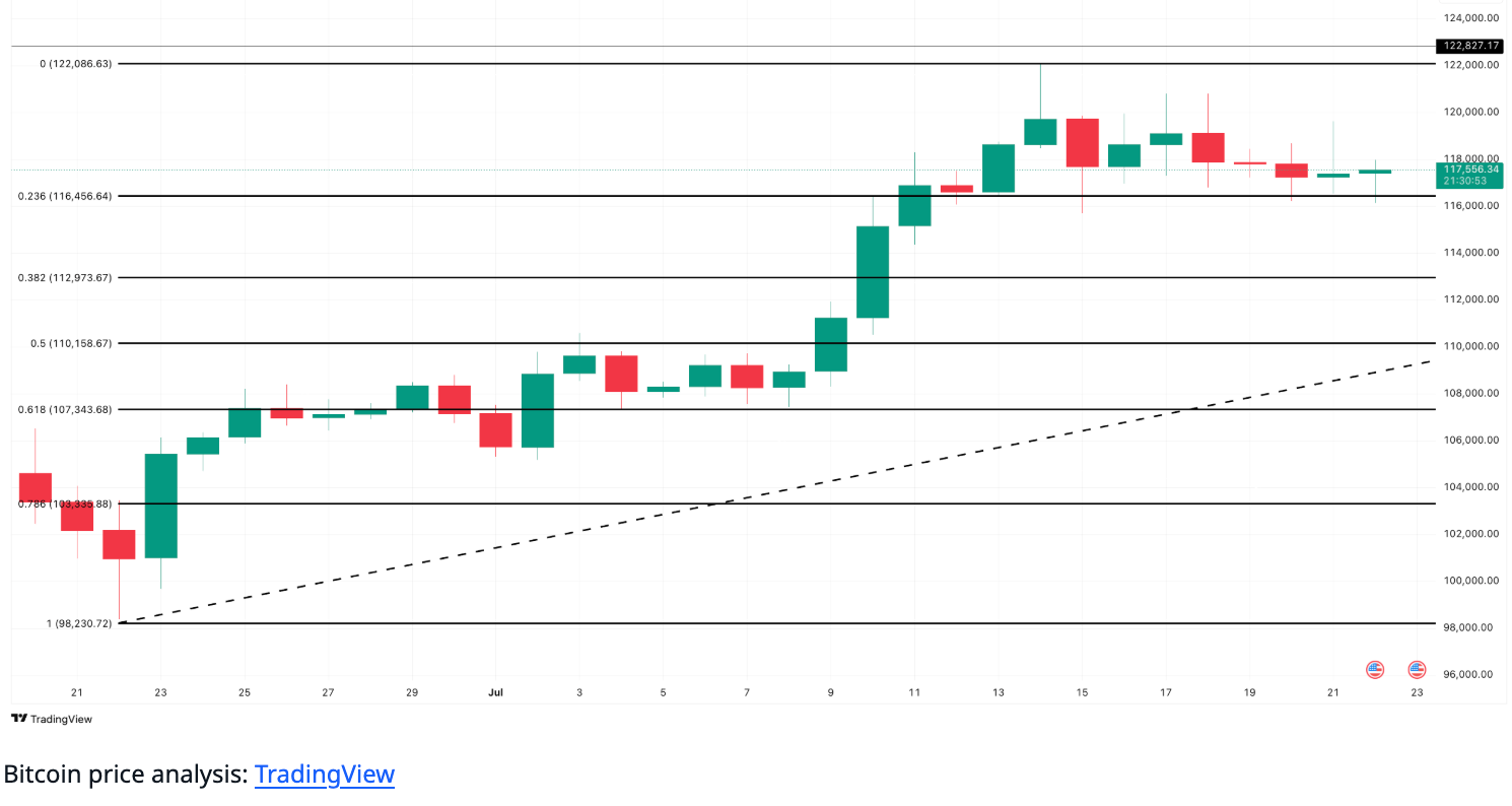 ビットコイン価格構造:重要なサポートレベルのテスト 現在のビットコイン価格は$117,500付近で推移しています。7月12日以来、ビットコインは$116,456のゾーンを何度もテストし、維持しています。この価格点は、最近の$98,230から$122,086の上昇幅の0.236フィボナッチリトレースメントレベルと一致しています。このゾーンは価格の重要なサポートレベルとなっており、価格がこのゾーンを下回ると、より深い下落の可能性が開かれるかもしれません。