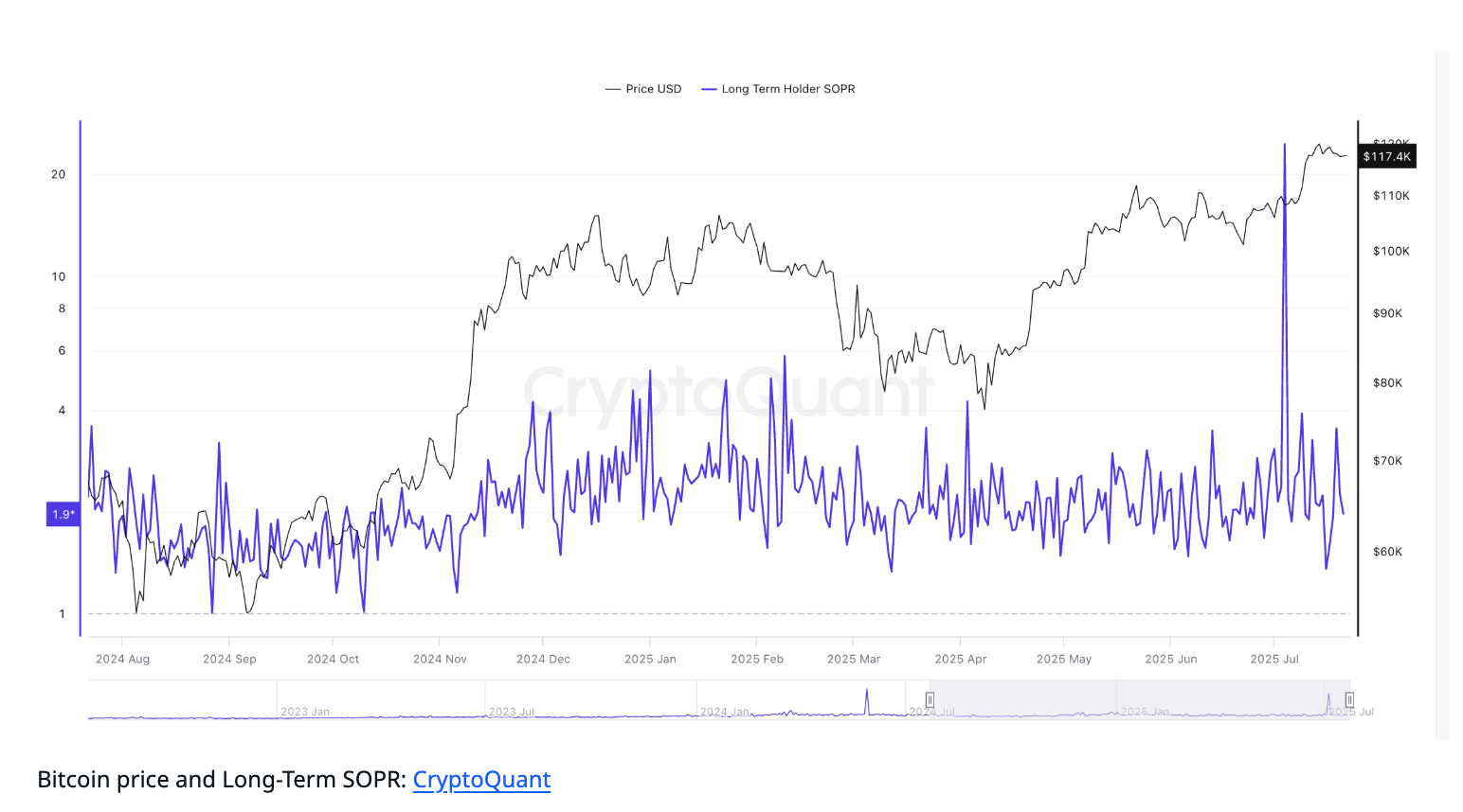 ビットコイン(BTC)価格は$117,500以上で推移していますが、内部信号は短期的にプルバックが発生する可能性を示唆しています。長期ホルダーのSOPR(Spent Output Profit Ratio)およびクジラの活動の変化は、市場が調整圧力に直面する可能性があることを示しています。歴史的データも、これらの信号が通常健康的な価格修正が間もなく来ることを予示していることを示しています。