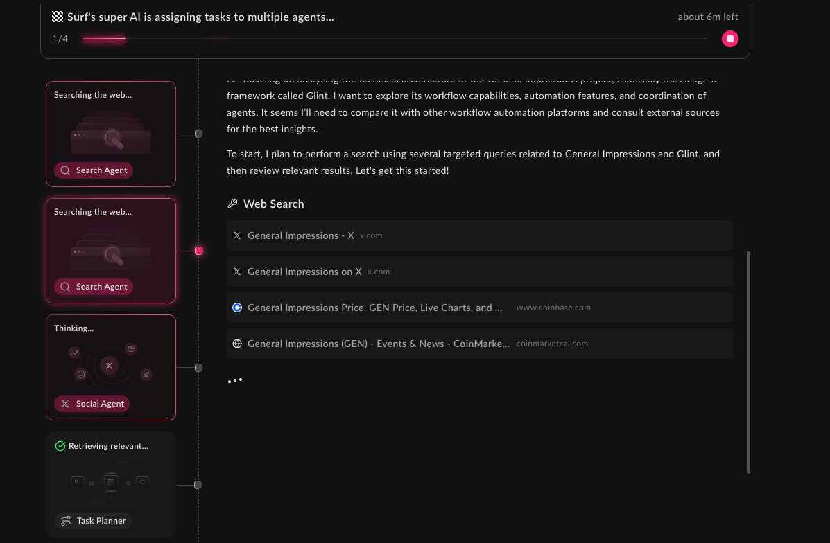 ユーザーのタスクリクエストは、複数の異なるエージェントに割り当てられ(下の図を参照)、それぞれのタスクを実行した後、結果を報告し統合します。このプロセスはリアルタイムで確認できます。