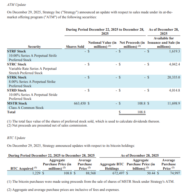 マイクロストラテジーは2025年12月22日から28日の期間に、約1.088億ドルの資金を投入して1,229枚のビットコインを購入し、平均購入価格は約88,568ドル/枚でした。 (前回の概要:マイクロストラテジーは9.8億ドルを追加投入し、1万枚のビットコインを買い増し、総保有数は67万枚を突破し、世界一の座を堅持) (背景補足:マイクロストラテジーは先週、ビットコインの買い増しを一時停止と発表:ATM資金調達7.4億ドルで現金準備を補充、債務と配当が差し迫った課題?)