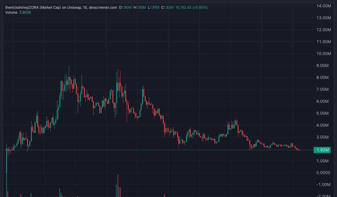 ソース:CryptoNewsNet オリジナルタイトル:ZORAはクリエイターコインの失望により再び下落 オリジナルリンク: 過去48時間、Baseエコシステムの支持者にとっては不安定な展開となった。バイラル動画ジャーナリストのNick ShirleyがZoraを通じてBase上にクリエイターコインをリリースした後、士気は一時的に高まったが、わずか2日も経たずに崩壊し、トークンは80%下落した。