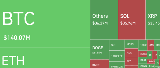 CoinGlassによると、過去24時間でビットコインから約1億4007万ドル(約2029億円)のポジションが清算された。このうち約77.44%はロング(買い)ポジションだった。全体のデジタル資産市場では4億4927万ドル(約6509億円)の清算が発生した。