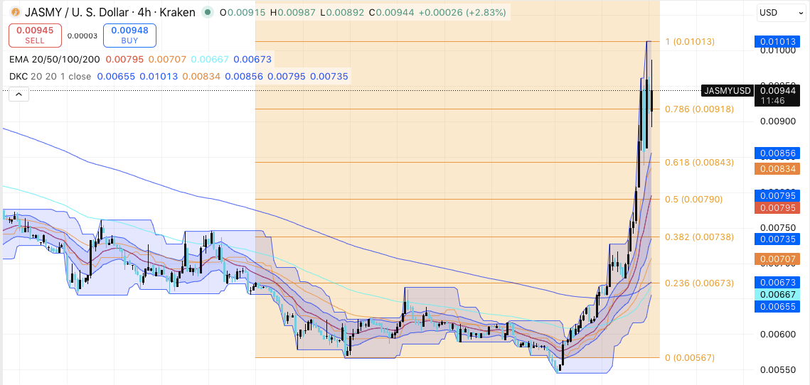 • JASMYは重要なFibサポートラインの上で高値を維持し、枯渇ではなく調整局面を示唆。