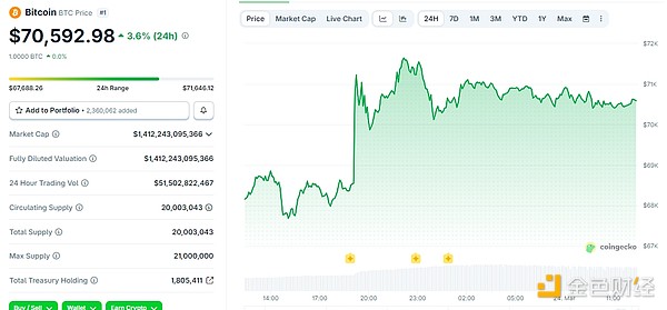 暗号市場は昨晩から上昇を始め、執筆時点でBTCは24時間で3.6%上昇し70,592.98ドル、ETHは4.1%上昇し2,139.39ドル、SOLは4.6%上昇し90.50ドルとなっている。