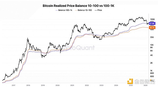 CryptoQuantのアドラー・ジュニアは、「ビットコインは現在、200週移動平均線付近で取引されており、価格は68,300ドル。これは『最大保有層(100-1000BTC)』の実勢価格と一致している。『価格が6.8万ドル以上を維持すれば、最大保有層はコストに近い安定を保てる。これを下回ると、構造が悪化し、大口投資家の反応も緊迫化する可能性がある』」と述べている。