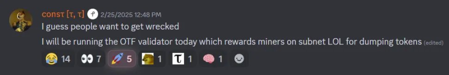 実際に起こったことは:投機者がSN28トークンを購入 → SN28の価格が上昇 → SN28がより多くのTAOを発行 → サブネットトークンの発行制限を超えると、SN28の価格がさらに上昇 → SNトークンの発行量がSNを保有する「マイナー」に比例して配分される → 人々はより多くのTAOを得るためにさらに多くのSNを購入 → 価格がさらに上昇 → ポンジスキームが続く。