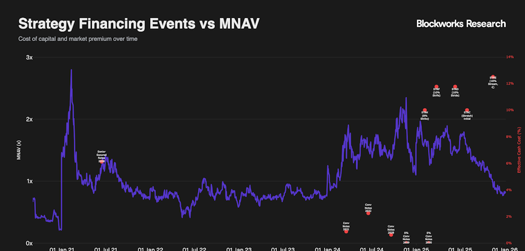 しかしながら、2025年中頃から後半にかけて、そのプレミアムは縮小し、割引(mNAV < 1)に反転し、株式連動の資金調達は困難になり、一般的な発行はBTC一株あたりの希薄化を機械的に引き起こすようになった。その結果、資金調達は高コストの優先株にシフトし、しばしば額面以下で発行され、調達資金に対して約10%から12.5%の実効キャッシュコストを生み出している。STRCの配当率は2025年8月の9%から2026年1月の11.0%に引き上げられ、チャネルを維持している。