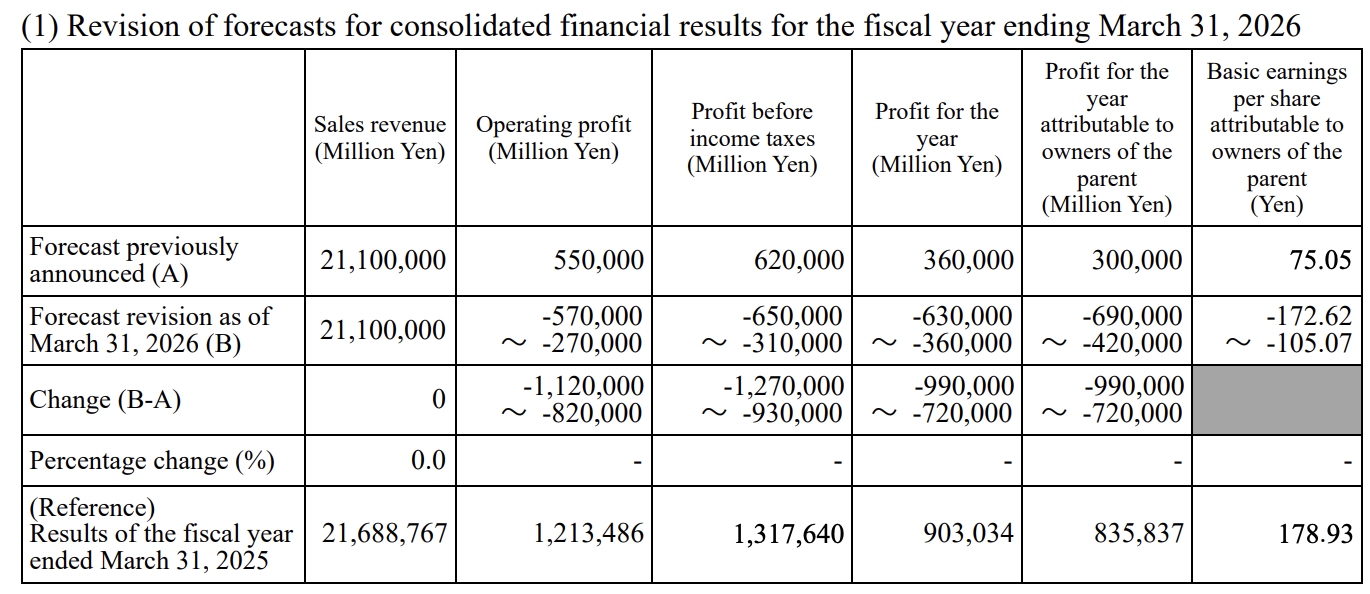 Honda has revised its consolidated operating profit forecast for the fiscal year ending March 2026 from 550 billion yen to a loss of 2.7 trillion to 5.7 trillion yen, a change of up to 8.2 trillion to 11.2 trillion yen. Pre-tax profit is also cut from 620 billion yen to a loss of 3.1 trillion to 6.5 trillion yen.