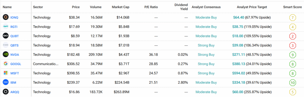 We used TipRanks’ Comparison Tool to line up notable quantum firms. In the list, you’ll find pure-play quantum stocks such as Rigetti RGTI -3.90% ▼ and D-Wave Quantum QBTS -3.49% ▼ , alongside big tech companies with quantum research such as Alphabet GOOGL -1.38% ▼ and Microsoft MSFT -0.44% ▼ . It’s a great tool for gaining an in-depth view of each pure-play quantum stock and the broader quantum computing industry.