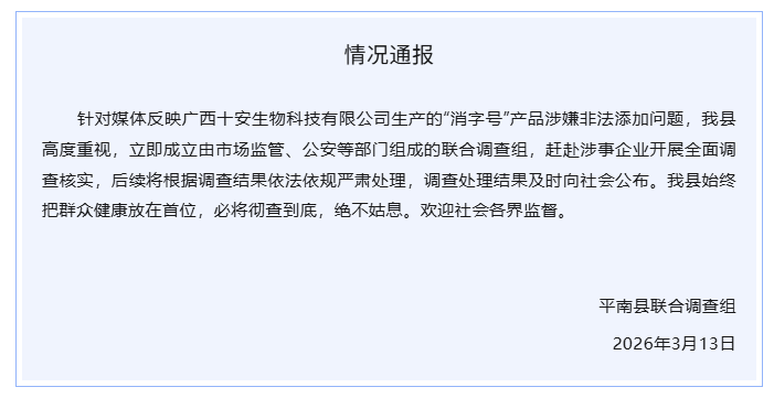 Guangxi Pingnan County Joint Investigation Team announced on March 13: In response to media reports that products labeled as “Xiaoxiao” produced by Guangxi Shian Biotechnology Co., Ltd. are suspected of illegal additives, our county attaches great importance. We immediately established a joint investigation team composed of market supervision, public security, and other departments, and dispatched them to the involved company to conduct a comprehensive investigation and verification. The follow-up will be handled strictly according to laws and regulations based on the investigation results, and the findings will be promptly disclosed to the public. Our county always prioritizes public health, and we will thoroughly investigate without leniency. We welcome supervision from all sectors of society.