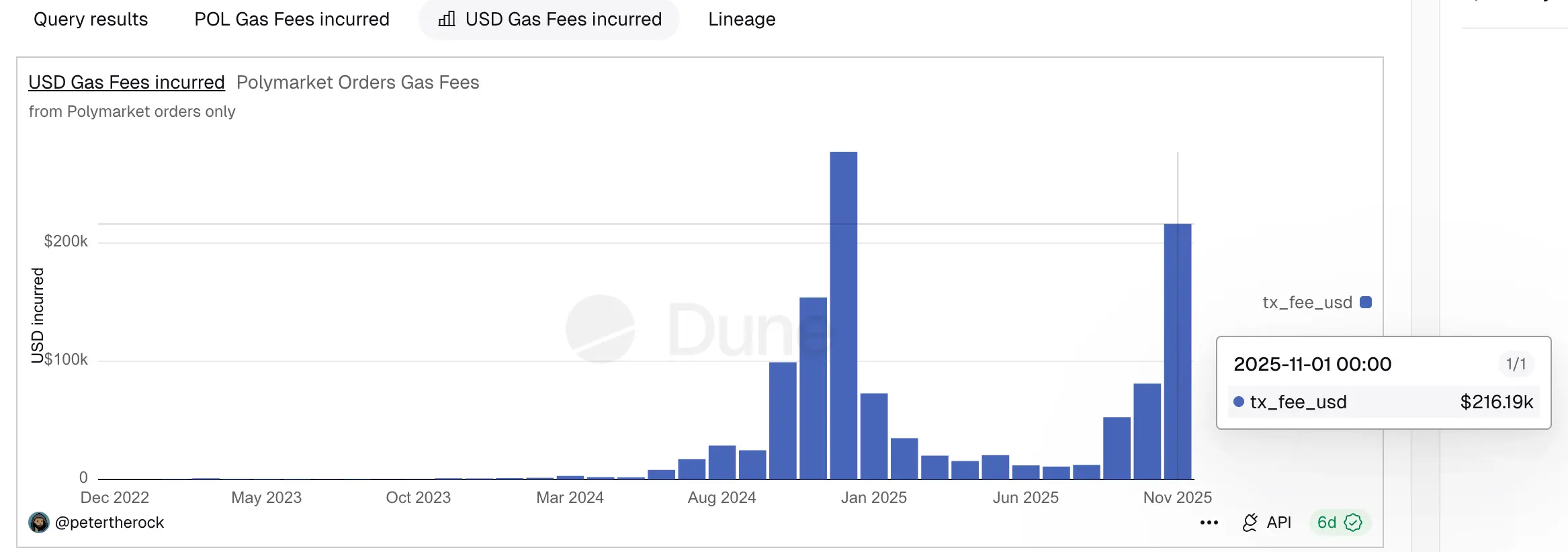 · Considering this data is somewhat outdated, we checked recent changes. Data analyst petertherock’s statistics on Dune show that in November, Polymarket-related transactions consumed about $216,000 worth of gas, while Token Terminal’s data indicates Polygon’s total gas consumption for that month was approximately $939,000, also close to a quarter (about 23%).