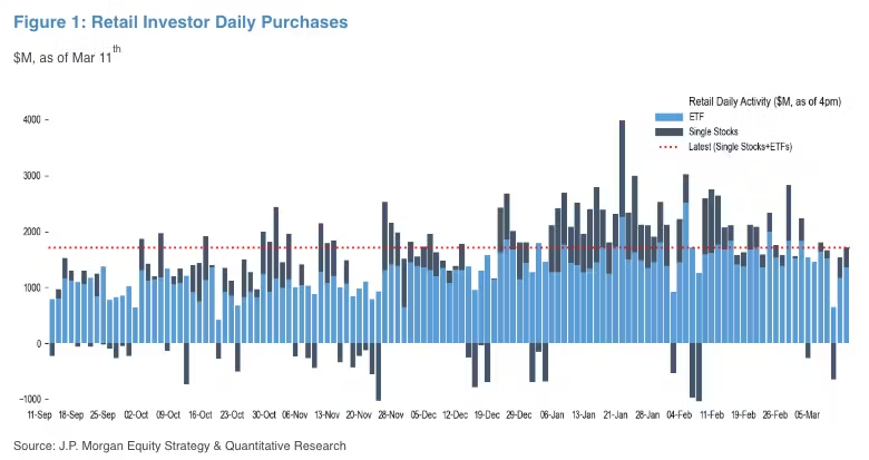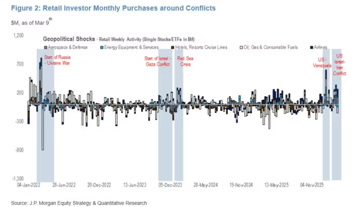 Cailian Press, March 13 (Editor: Huang Junzhi) Recently, as the US-Iran conflict continues to escalate, retail investors who heavily bought the dip during last year’s “Liberation Day crash” and other pullbacks seem to have lost their enthusiasm. JPMorgan released a new report indicating that the retail investor group is showing “signs of persistent weakness,” a rare signal since the bank began tracking it.