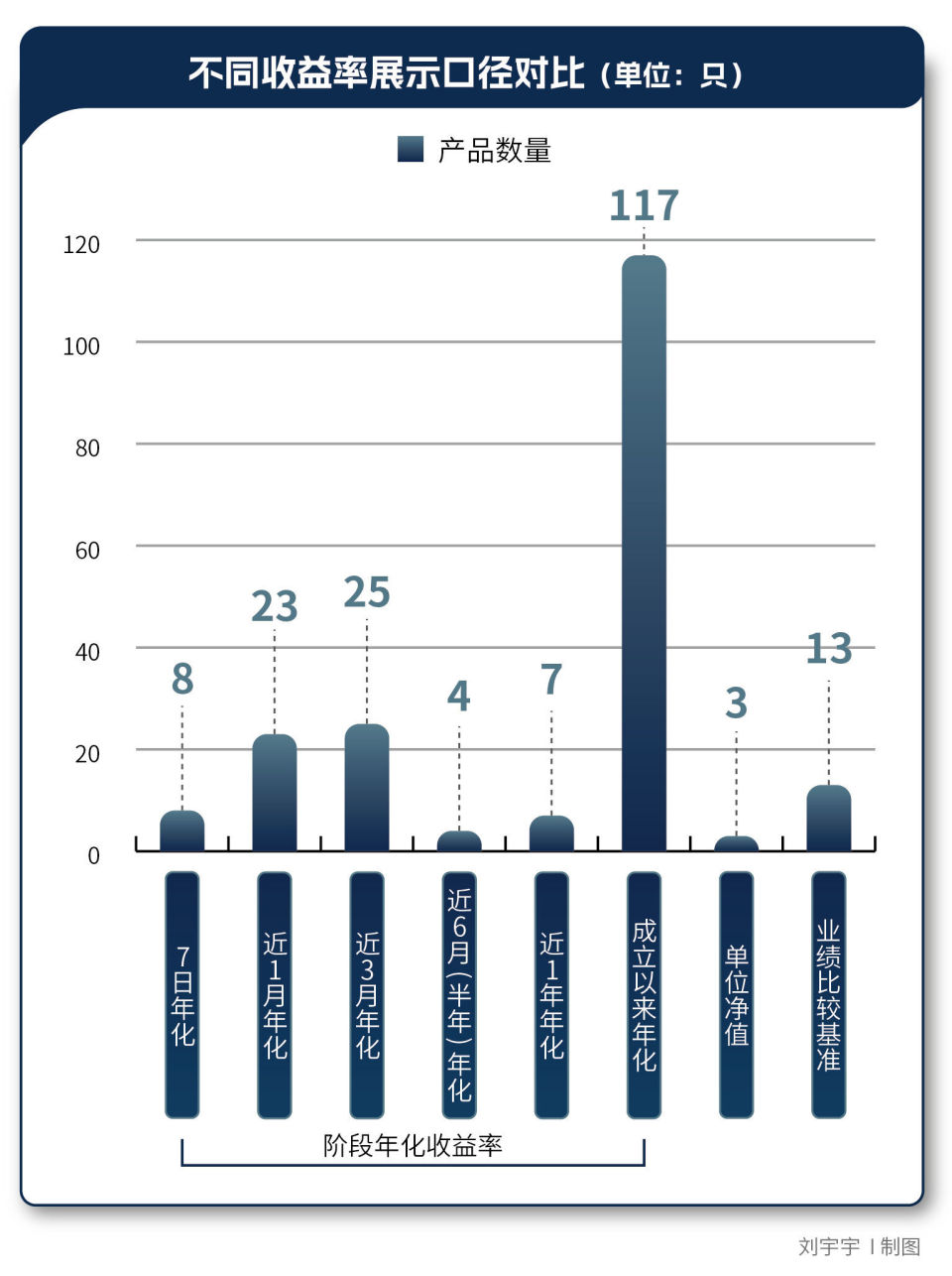 The test showed that “since inception annualized yield” was used frequently (117 products, nearly 60%), followed by “3-month annualized yield” (25 products, 12.5%) and “1-month annualized yield” (23 products, 11.5%). The frequent use of “since inception” is related to declining market interest rates and continuous drops in product yields.