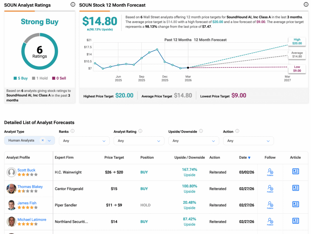 According to TipRanks, SOUN stock has received a Strong Buy consensus rating, with five Buys and one Hold assigned in the last three months. The average SoundHound stock price target is $14.80, suggesting a potential upside of 98.13% from the current level.