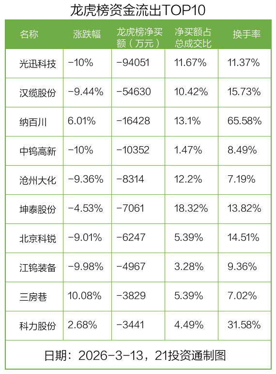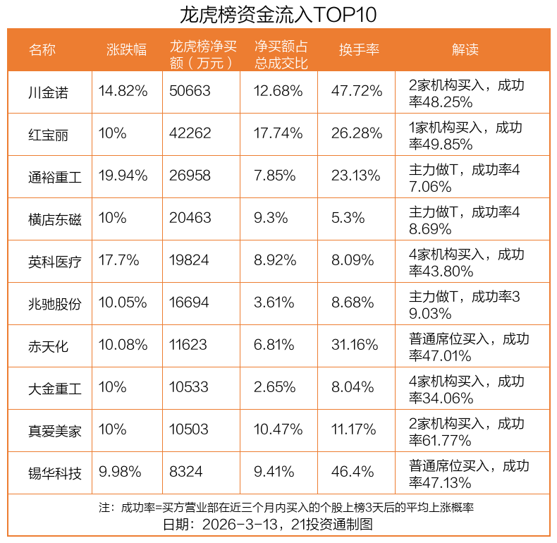 On March 13, the Shanghai Composite Index fell 0.81%, the Shenzhen Component Index declined 0.65%, and the ChiNext Index dropped 0.22%. After-hours龙虎榜 data shows that a total of 46 stocks experienced unusual trading activity and appeared on the龙虎榜, with the largest net capital inflow into ChuanJinNuo (300505.SZ), totaling 507 million yuan.