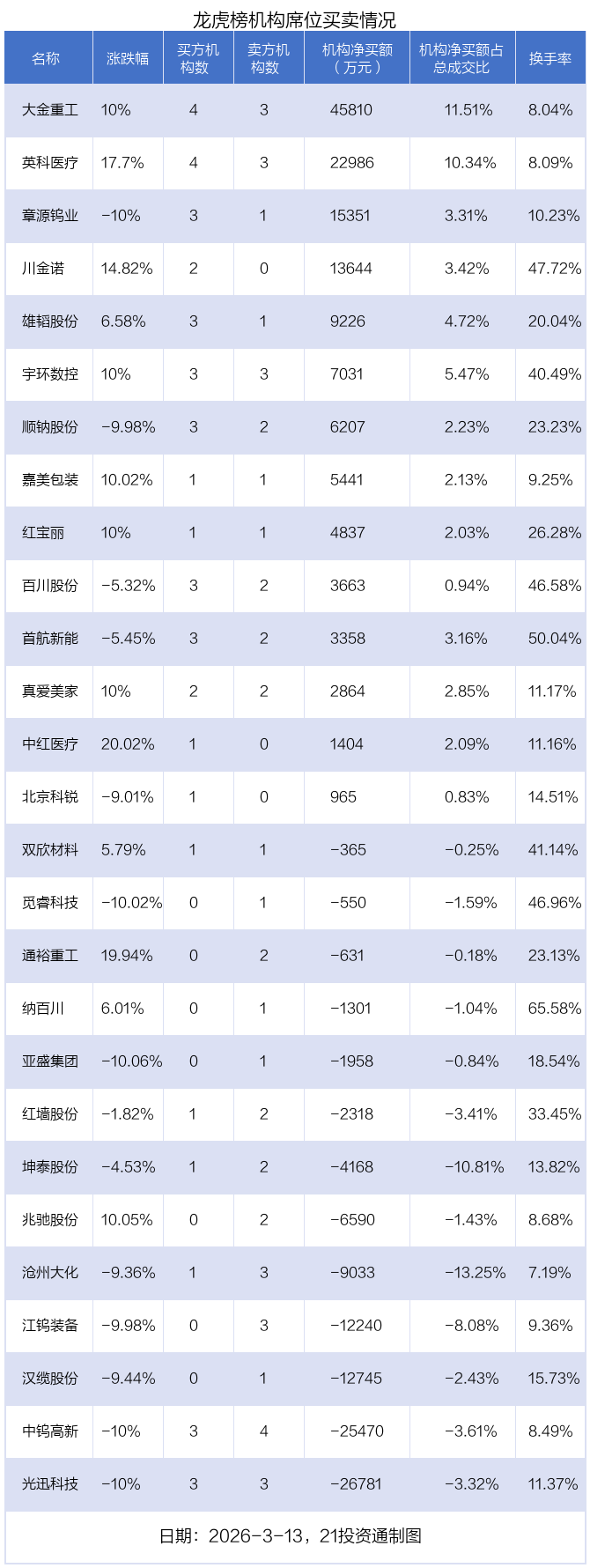 The stock with the highest net institutional buy was Dajin Heavy Industry (002487.SZ), which closed up 10% that day, with a turnover rate of 8.04%.
